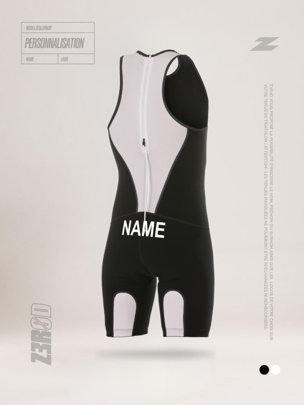 Z3R0D offers you the possibility to print your name / last name / pseudo (text only) on your triathlon kit (on the butt) (trisuit, singlet or shorts)!