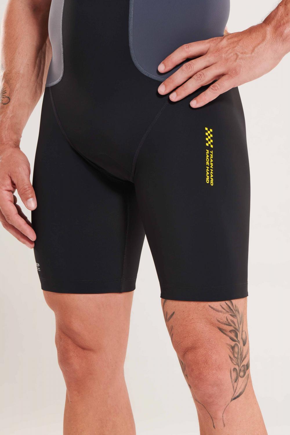 Un imprimé graphique racing sur la jambe gauche met en avant notre devise « train hard, race hard » et dans le dos figurent les coordonnées du lieu le plus mythique au monde pour tout triathlète qui se respecte.