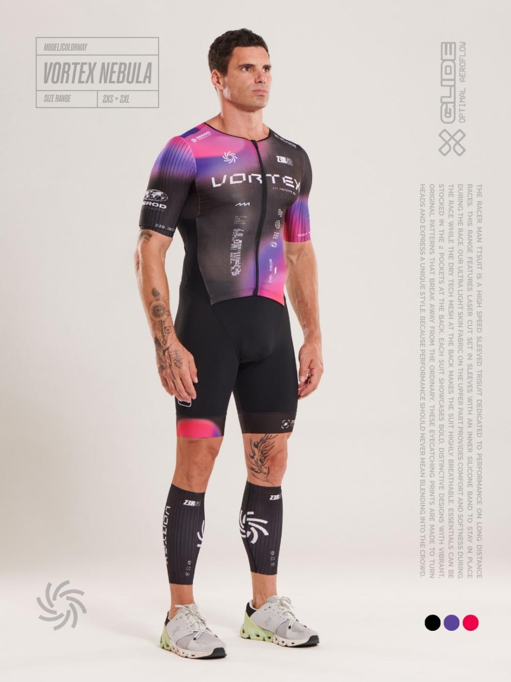 La gamme Vortex propulse les triathlètes dans un univers futuriste et spatial, où chaque détail graphique incarne la vitesse et l’énergie explosive de l’univers. Inspirée par les étoiles, le soleil, les éclipses et les voyages interstellaires, cette collection traduit l’essence même de la performance : aller toujours plus vite, toujours plus loin.