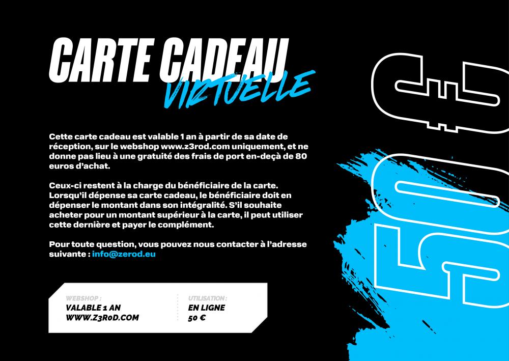 Les cartes cadeaux Z3R0D sont échangeables contre des articles uniquement sur le site www.z3r0d.com. Elles peuvent être achetées et utilisées uniquement sur le site www.z3r0d.com. Elles expirent au-delà d’un an suivant la date d’émission de la carte.